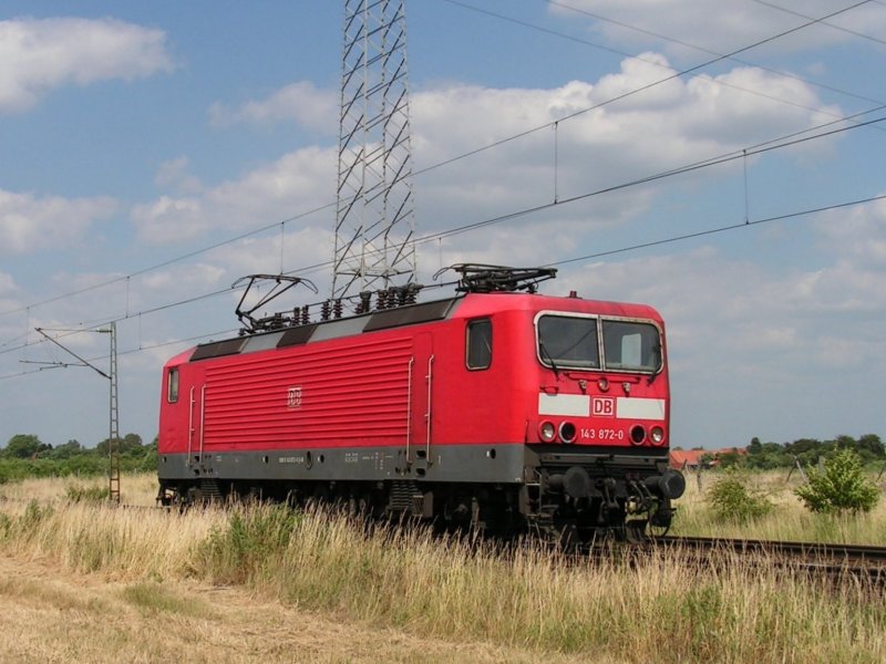 Am 26.6.08 ist BR 143 872-0 allein auf Spazierfahrt entlang der KBS 380 Richtung Hannover unterwegs.