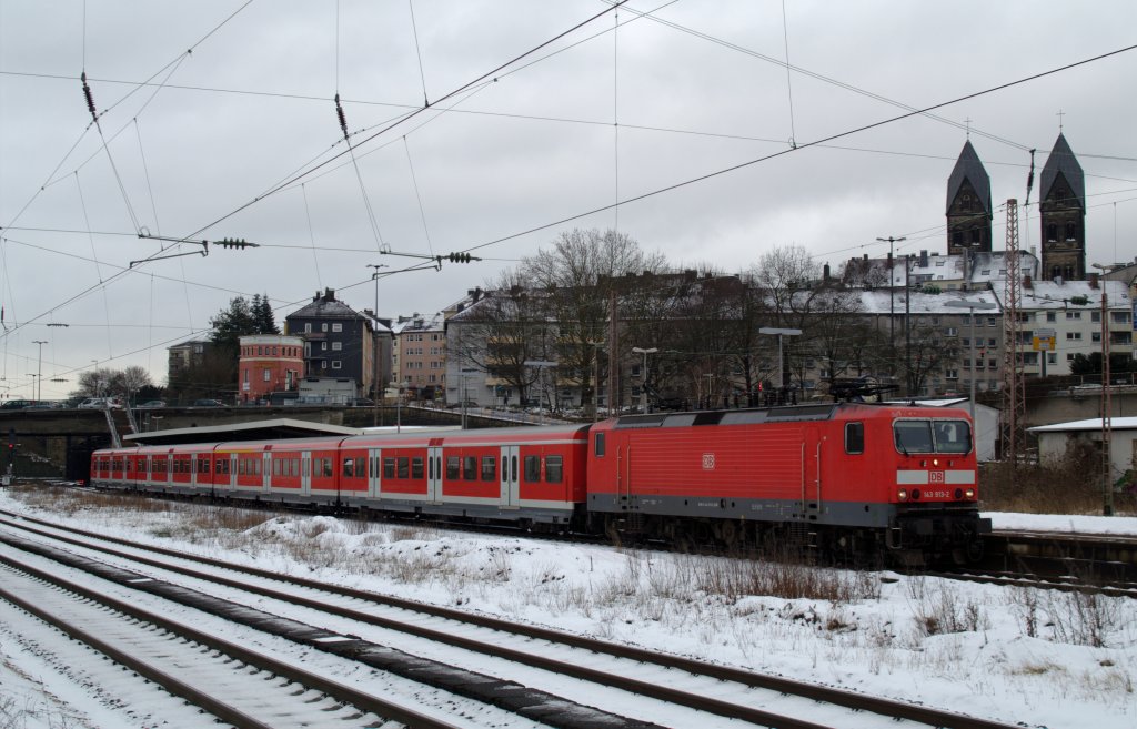 S8 nach Mönchengladbach gezogen von 143 913-2 unmittelbar vor der Abfahrt aus Wuppertal Steinbeck. 28.01.2010