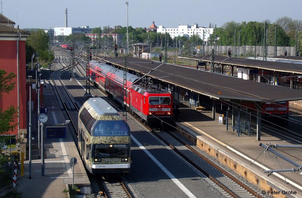 DVE 670 003-2   Fürstin Louise   ( ex 670 006 ) Doppelstock-Schienenbus DWE, KBS 257 Dessau - Wörlitz, fotografiert in Dessau Hbf. kurz vor Abfahrt nach Wörlitz am 25.04.2012 --> rechts DB 143 934-8 vor RB 17 861 Halle - Lutherstadt Wittenberg