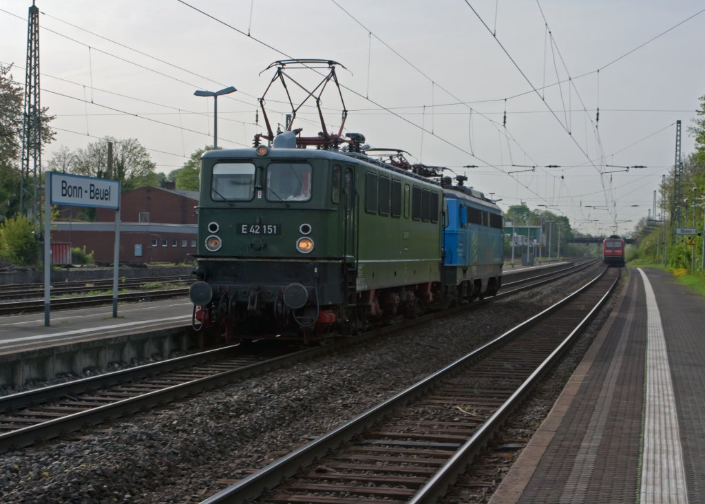 E 42 151 (ex DR 242 151-9) der TEV (Thüringer Eisenbahnverein e.V.) fährt am 11.04.2011 mit CBB 91 80 1042 520-8 (ex ÖBB 1042 520-8) am Haken durch den Bf Bonn-Beuel, Richtung Norden. Rechts hinten schiebt 143 943-9 dir RB 27 weiter Richtung Koblenz. Armin Schwarz