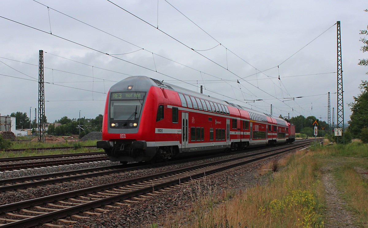 RE 4782 (Dresden Hbf - Hof Hbf) hat soeben Zwickau verlassen und überquert gerade die Olzmannbrücke. Am 24.06.2015 schiebt die 143 952-0 jenen RE3 nach Hof.