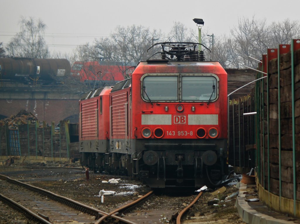 Mal wieder ein etwas trauriges Bild. 143 953-8 steht mit zwei weiteren 143er am dunstigen Karfreitag (29.03.2013) zum verschrotten in Eschweiler-Aue bei Steil. Im April letzten Jahres konnte ich die Lok noch mit RB28 auf der rechten Rheinseite bei Leubsdorf im Einsatz fotografieren. Im Hintergrund sieht man noch eine 185er mit einem Kesselzug auf der KBS 480 richtung Köln fahren.
