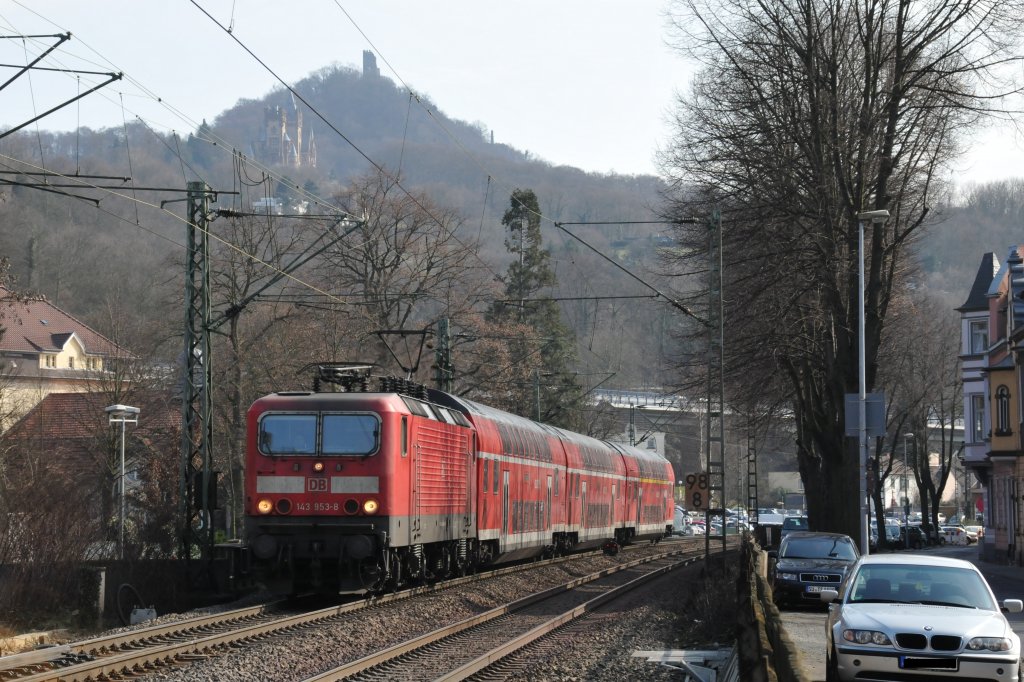 Sozusagen im Schatten vom Drachenfels und vom Schloss Drachenfels im Hintergrund nähert sich 143 953-8 mit ihrem RB dem Bhf Königswinter. Aufgenommen am 12/03/2011.