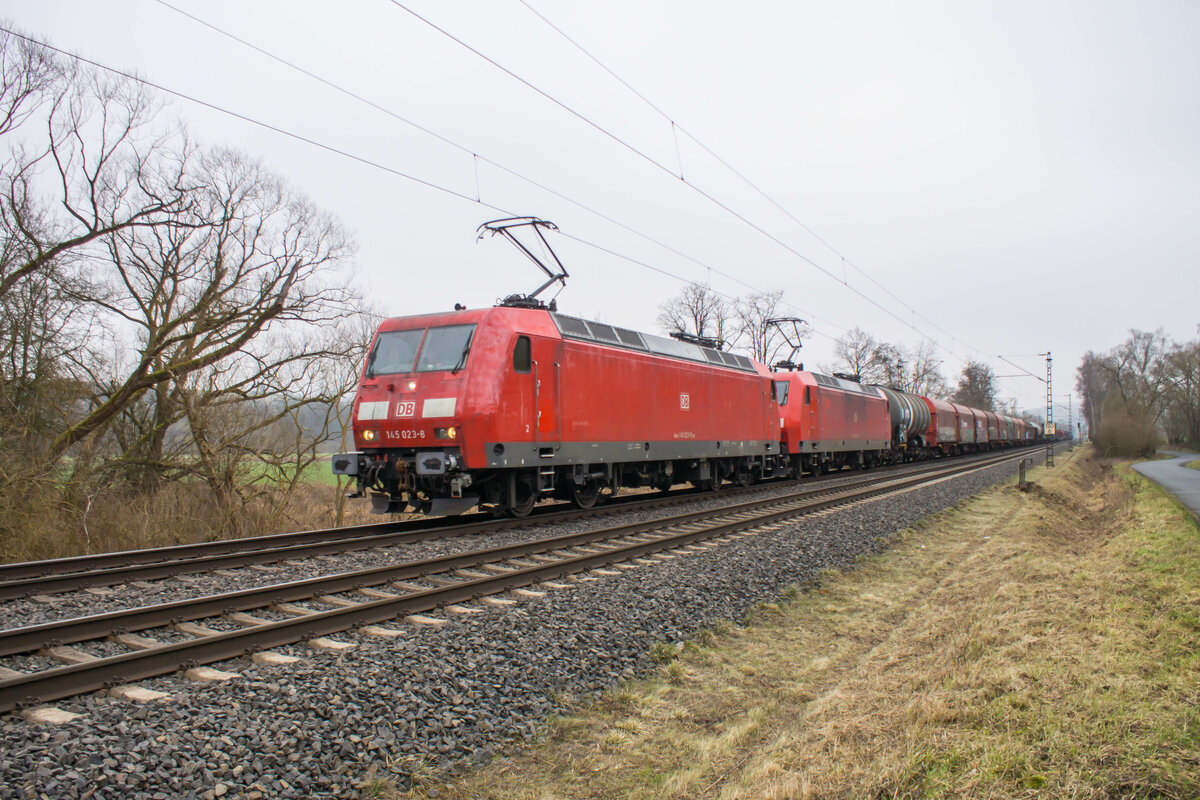 145 023-8 u.145 016-2 sind mit einem gemischten Güterzug bei Unterhaun am 15.02.2023 zu sehen.