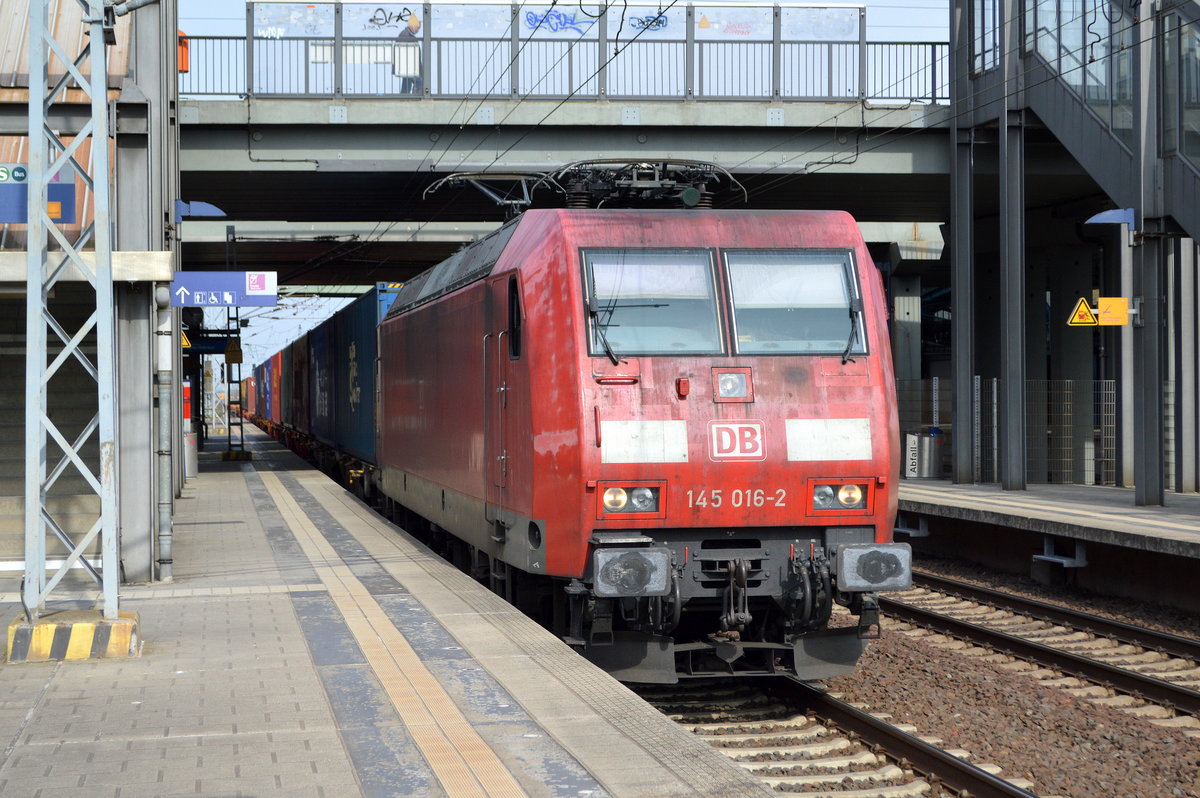 DB Cargo AG [D] mit "145 016-2" [NVR-Nummer: 91 80 6145 016-2 D-DB] und einem schwach ausgelastetem Containerzug am 09.04.21 Durchfahrt Bf. Berlin Hohenschönhausen.