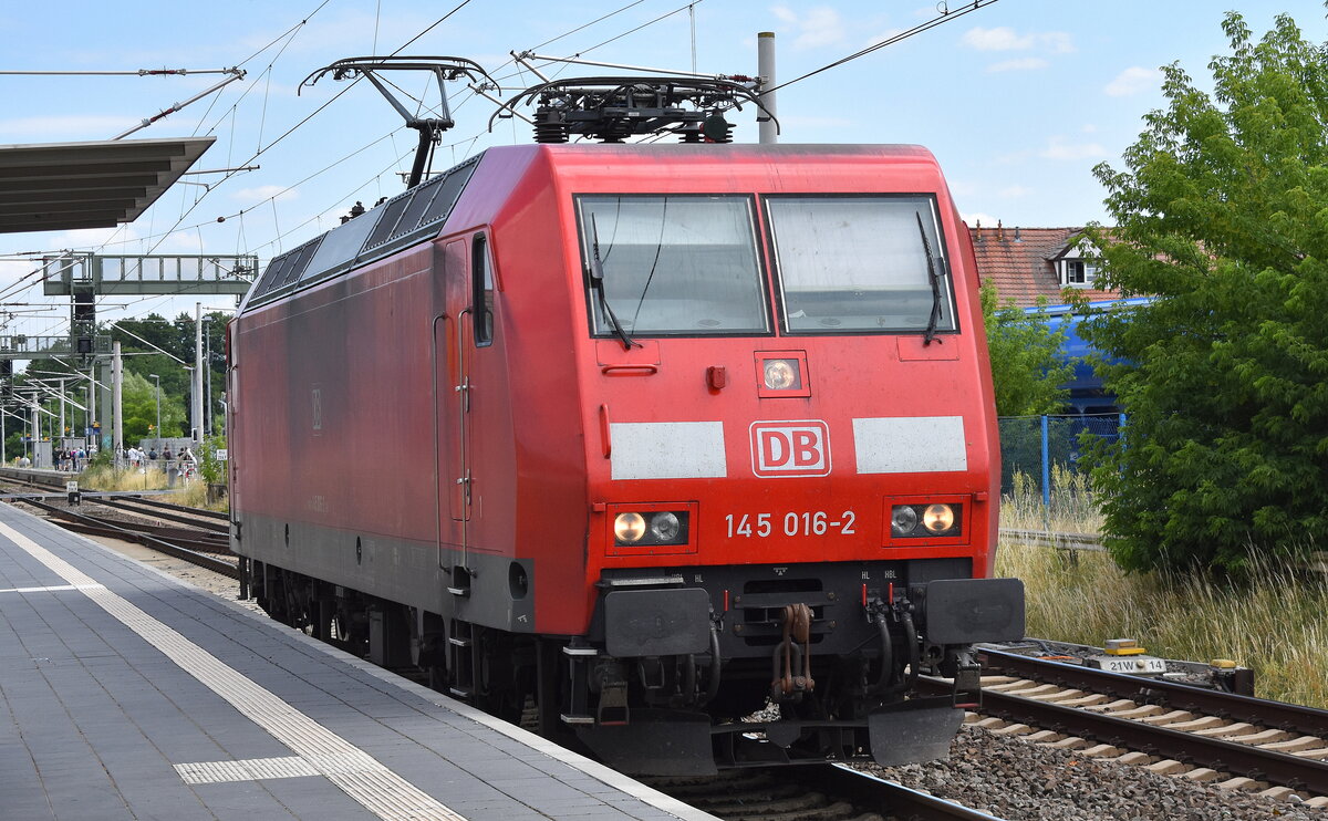 DB Cargo AG [D] mit ihrer "145 016-2" [NVR-Nummer: 91 80 6145 016-2 D-DB] am 29.06.23 Durchfahrt Bahnhof Lutherstadt Wittenberg-Piesteritz.