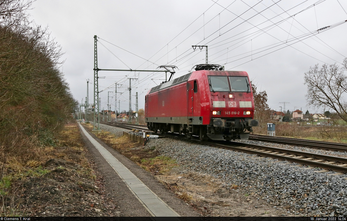 Gleich hinter dem Kesselzug ist noch 145 016-2 ohne Anhang unterwegs an der Saaleaue bei Angersdorf Richtung Halle (Saale). 🧰 DB Cargo 🕓 18.1.2022 | 14:06 Uhr