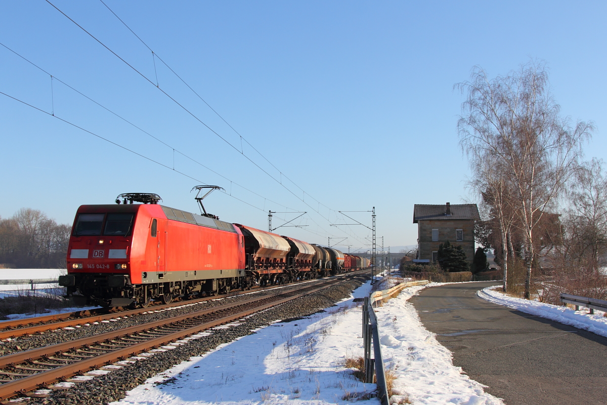 145 042-8 ist mit einen gemischten Güterzug am 28.01.15 in Hermannspiegel unterwegs.