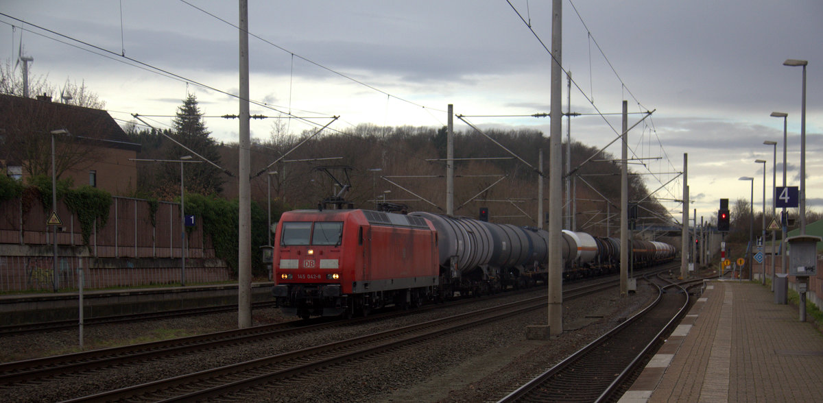 145 042-8 von DB kommt mit einem Kesselzug aus aus Antwerpen-BASF(B) nach Ludwigshafen-BASF(D) und kommt aus Richtung Aachen-West,Aachen-Schanz,Aachen-Hbf,Aachen-Rothe-Erde,Aachen-Eilendorf,Stolberg-Hbf(Rheinland)Eschweiler-Hbf und fährt durch Langerwehe in Richtung Düren,Merzenich,Buir,Horrem,Kerpen-Köln-Ehrenfeld,Köln-West,Köln-Süd. Aufgenommen von Bahnsteig 4 in Langerwehe. Bei Sonne und Wolken am Mittag vom 20.12.2019.