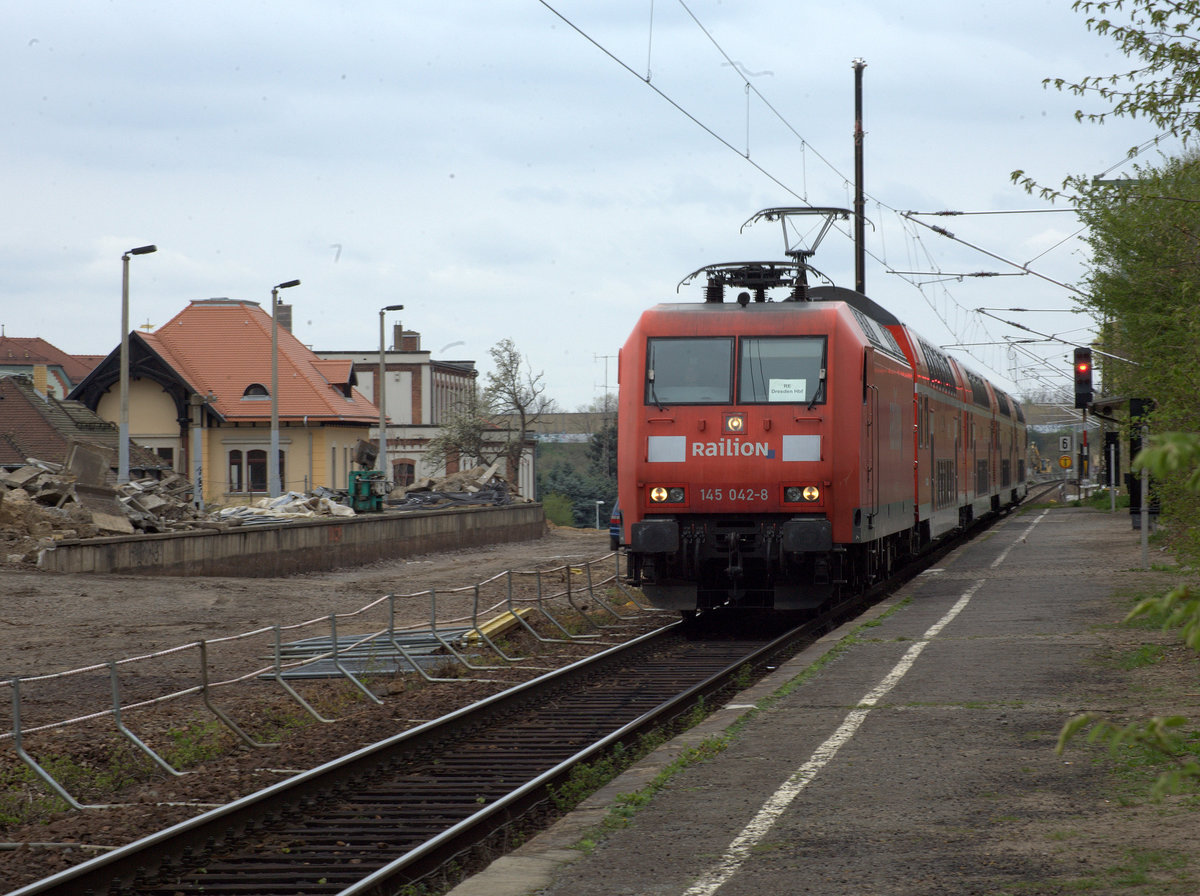 Ein nicht typische Lok  für einen RE  ist hier 145 042 -8, aufgenommen am 16.04.2012 am Haltepunkt der S1 Dresden Trachau.Selbiger ist völlig umgestaltet und 145 042-8 schon lange nicht mehr vor dem RE 50  Saxonia anzutreffen.