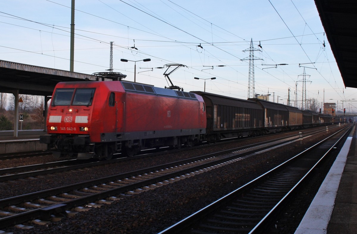Hier 145 042-8 mit einem Güterzug, bei der Durchfahrt am 18.1.2014 durch Berlin Schönefeld Flughafen, in Richtung Genshagener Heide.