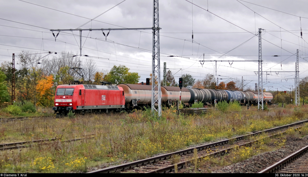 Kurzer Kesselzug mit 145 042-8 durchfährt den Bahnhof Angersdorf auf Gleis 10 Richtung Halle Rosengarten. Aufgenommen von Bahnsteig 2/3. 🧰 DB Cargo, vermietet an die Mitteldeutsche Eisenbahn GmbH (MEG) 🚝 EZ 52174 Buna Werke–Halle ZBA Süd 🚩 Bahnstrecke Merseburg–Halle-Nietleben (KBS 588) 🕓 30.10.2020 | 15:31 Uhr