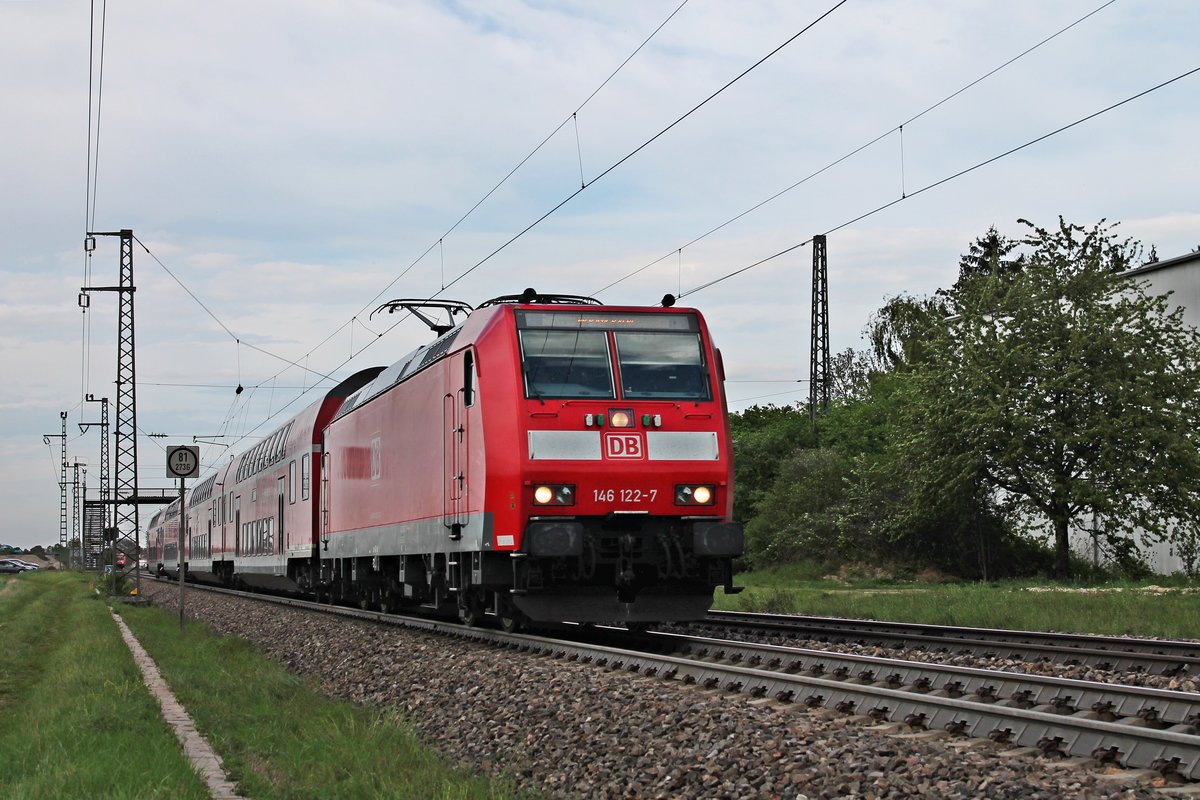 Am Nachmittag des 13.06.2019 fuhr die Münsteraner 146 122-7, welche an das BW Freiburg (Breisgau) ausgeliehen war, südlich von Buggingen mit ihrem RE (Offenburg - Basel SBB) über die Rheintalbahn in Richtung Müllheim (Baden).
