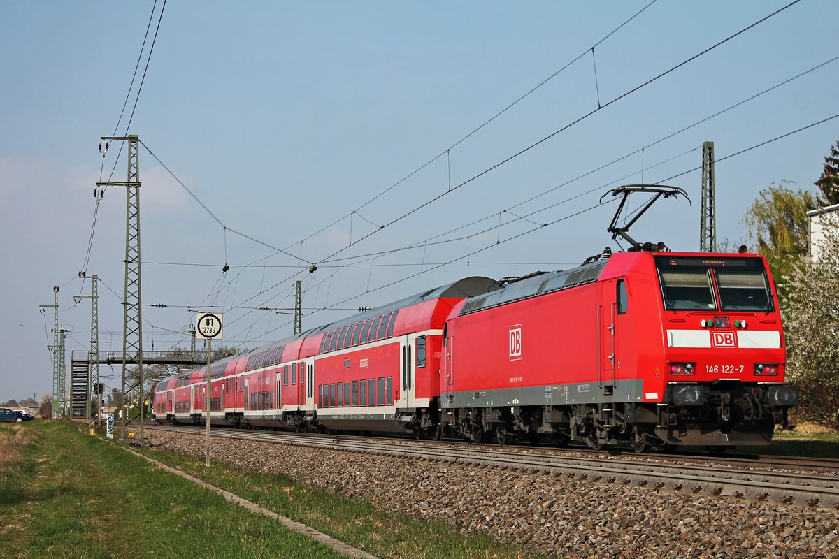 Nachschuss auf die Dortmunder 146 122-7, welche an das BW Freiburg (Breisgau) ausgeliehen war, als diese am Nachmittag des 11.04.2019 mit ihrem RE (Basel Bad Bf - Offenburg) in den Haltepunkt von Auggen einfuhr.