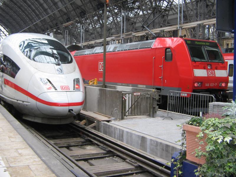 Frankfurt Hbf am 14.05.2005: abfahrbereiter ICE 914 von Franfurt/M. nach Köln neben einem RE mit 146 122-7