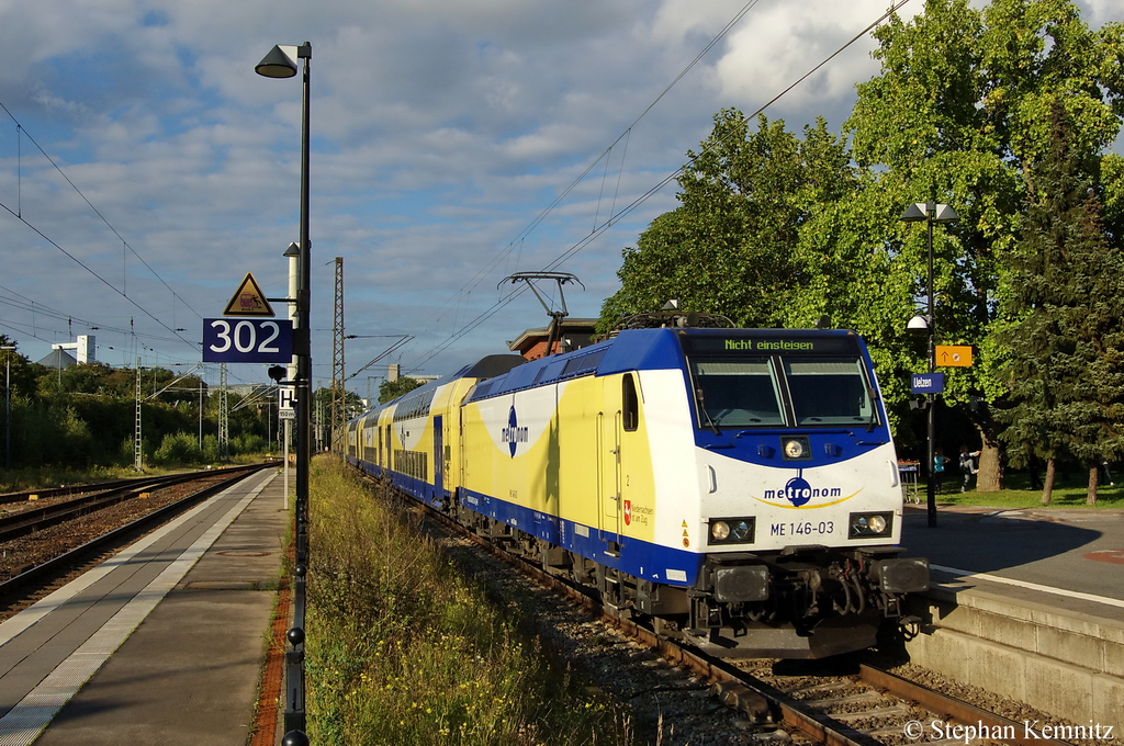 In Uelzen kommt gerade die ME 146-03 [Name: Bienenbüttel] (146 503-8) mit dem (ME 82123) aus Hamburg an und fährt dann in das Bahnbetriebswerk. 01.09.2011