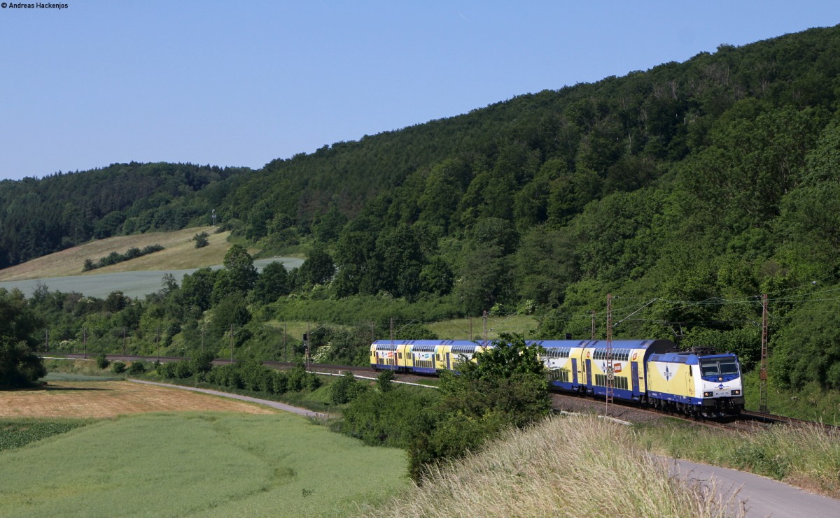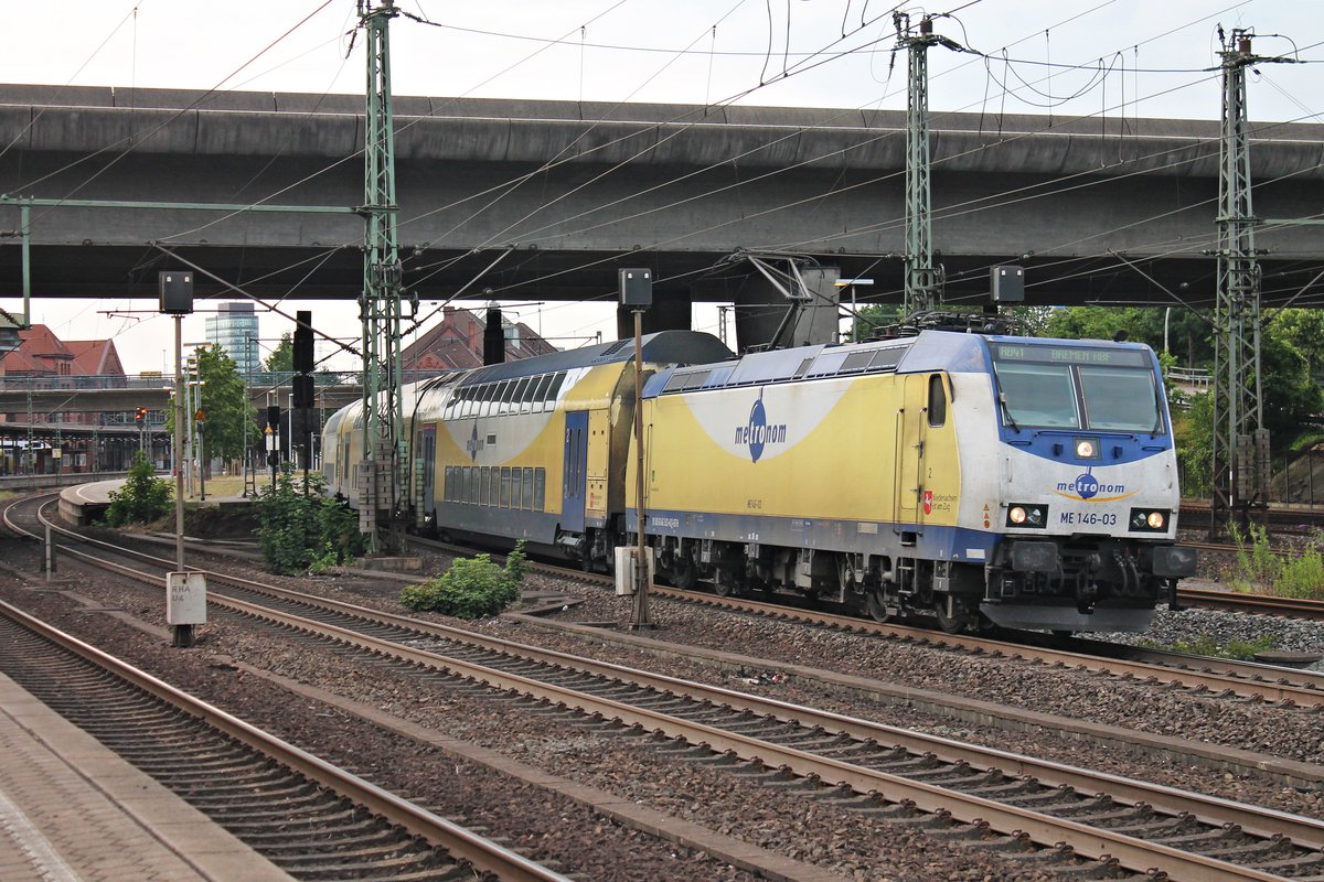 Mit einer RB 31 (Hamburg Hbf - Bremen Hbf) fuhr am Abend des 18.07.2019 die LNVG/ME ME 146-03 (146 503-8) "Bienenbüttel" aus dem Bahnhof von Hamburg Harburg in Richtung Maschen.