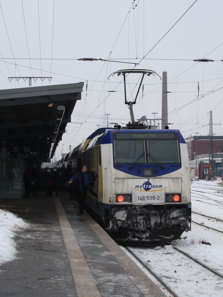 Schwungvoll verlässt der Tf am 29.12.2010 die ME 146-539-2 und übergibt den Zug an einen Kollegen, der ihn von Bremen nach Hamburg fahren wird. Hendrik Röben