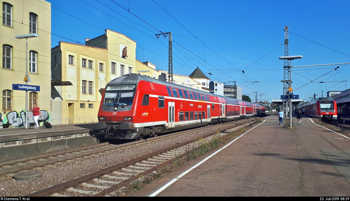 Smartphone-Aufnahme von DABpbzfa 762 mit Schublok 147 003-8 von DB Regio Baden-Württemberg als RE 19053 von Lauda nach Stuttgart Hbf, der auf 423 022-3 und 423 ??? der S-Bahn Stuttgart als S4 von Backnang nach Stuttgart Schwabstraße im Bahnhof Ludwigsburg trifft.
