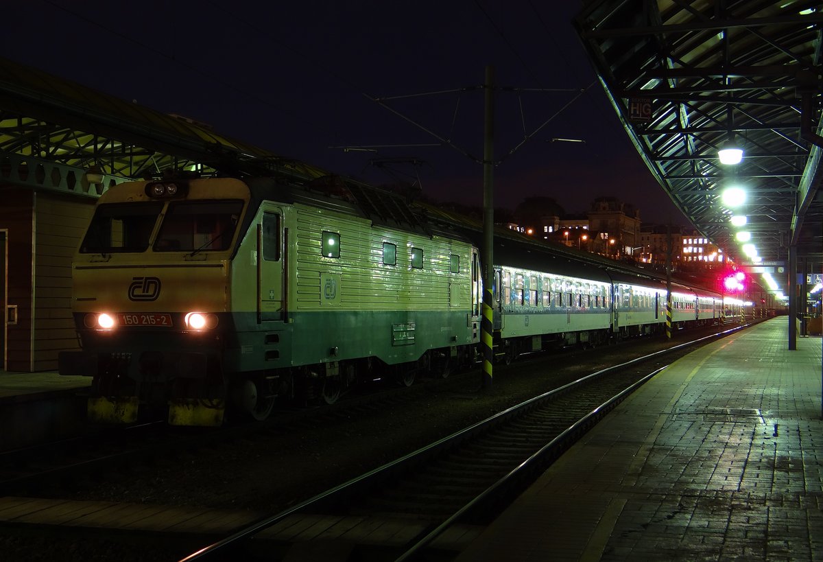 7.4.2012 15:08 ČD 150 215-2 mit einem Schnellzug (R) aus Luhačovice nach Praha-Smíchov bei der Einfahrt in den Bahnhof Praha hl.n..