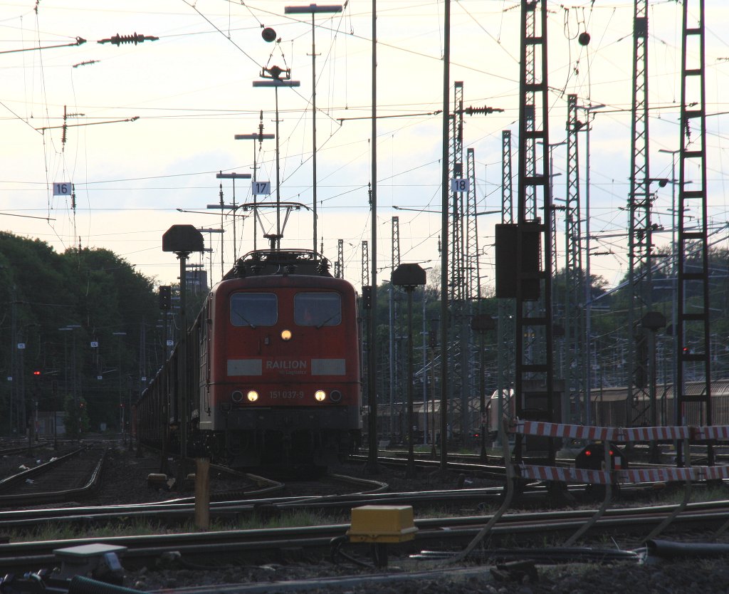 151 037-9 von Railion steht in Aachen-West  mit einem langen gemischten Güterzug aus Osnabrück nach Kortenberg-Goederen(B) am Abend des 15.5.2013.