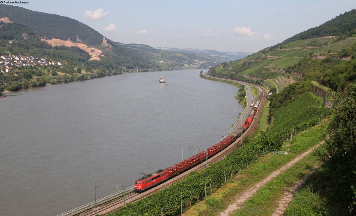 151 037-9 mit gemischtem Güterzug in Fahrtrichtung Koblenz. Aufgenommen in Kaub am Rhein am 16.07.2015.
