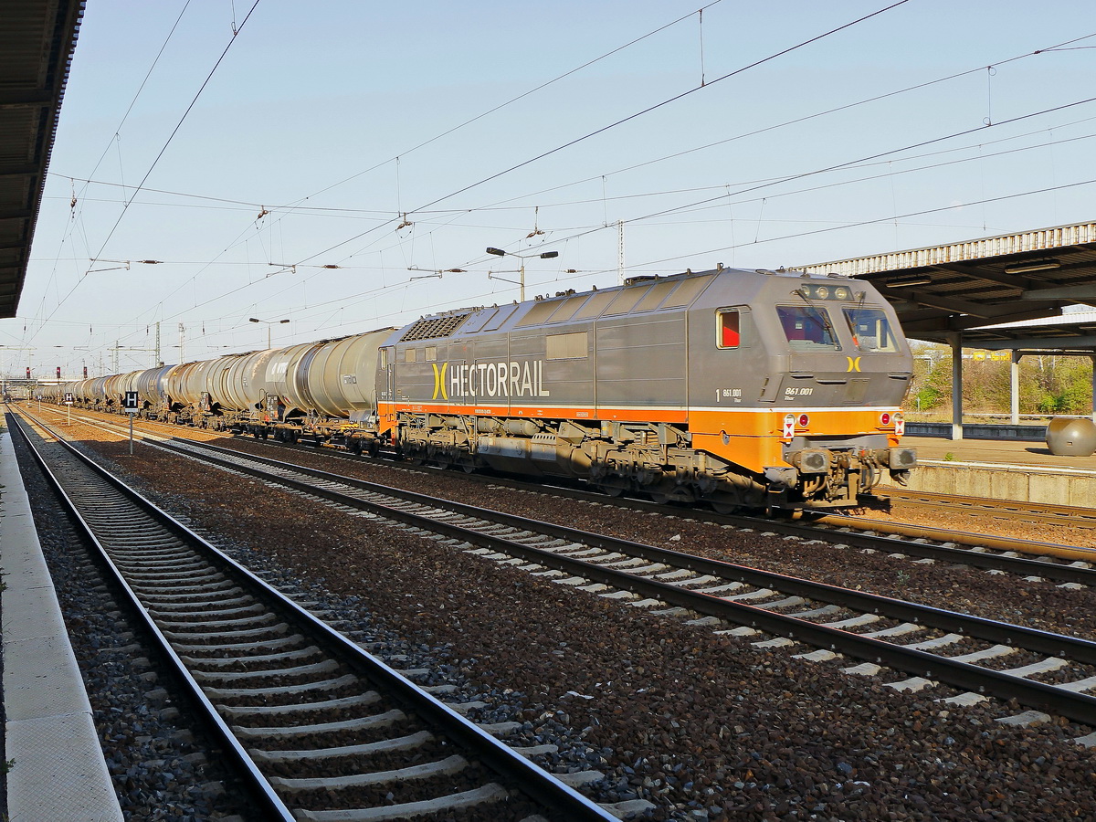 Am 17. April 2019  Kesselzug durch den Bahnhof Berlin Flughafen Schönefeld, Zuglok war 162 004 (151 057-7) und am Ende war 861 001 („Thor ) kalt.