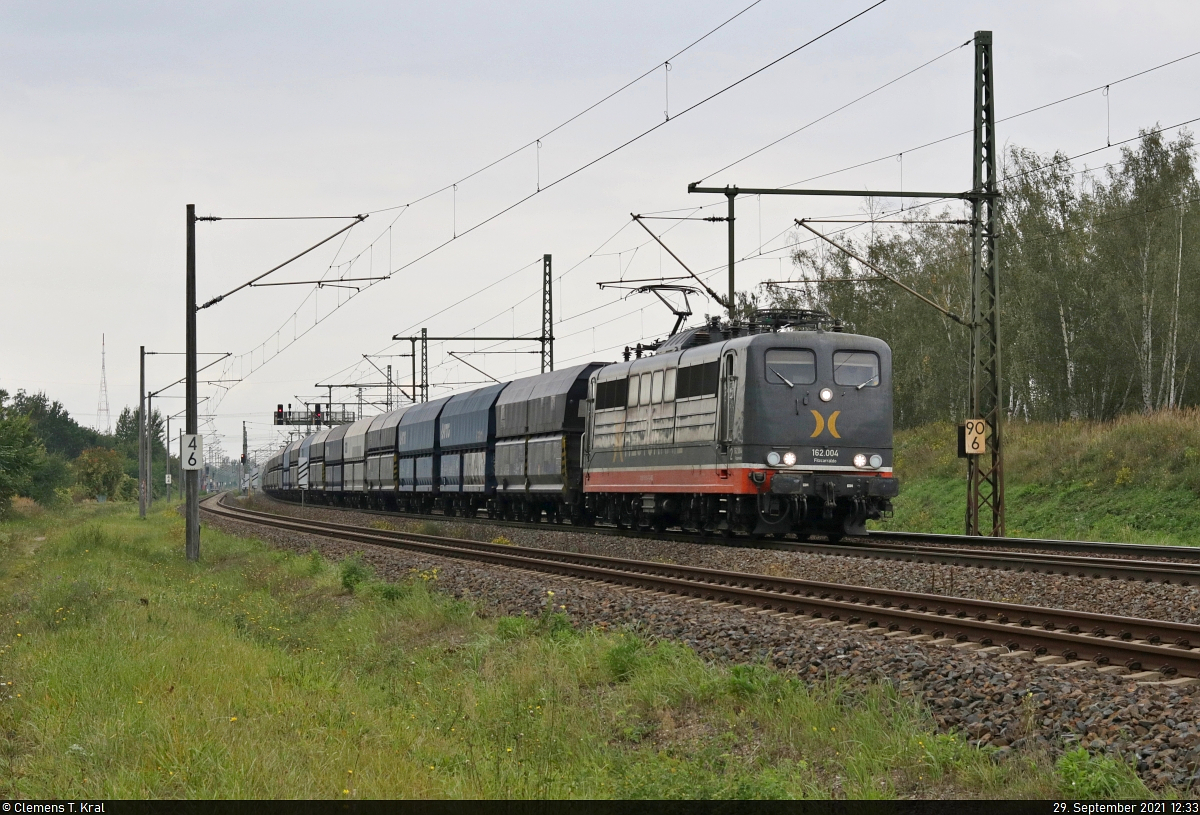Spot an für  Fitzcarraldo  aka 162.004 (91 80 6 151 057-7) mit Ihrem Güterzug auf dem Weg durch Zossen gen Süden.