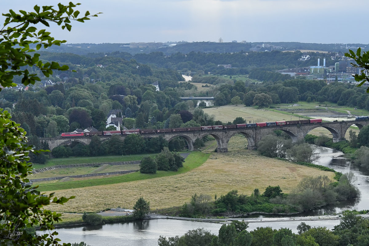 Ein Güterzug gezogen von der Elektrolokomotive 151 075-8 befährt im Juni 2018 das Ruhrviadukt bei Witten.