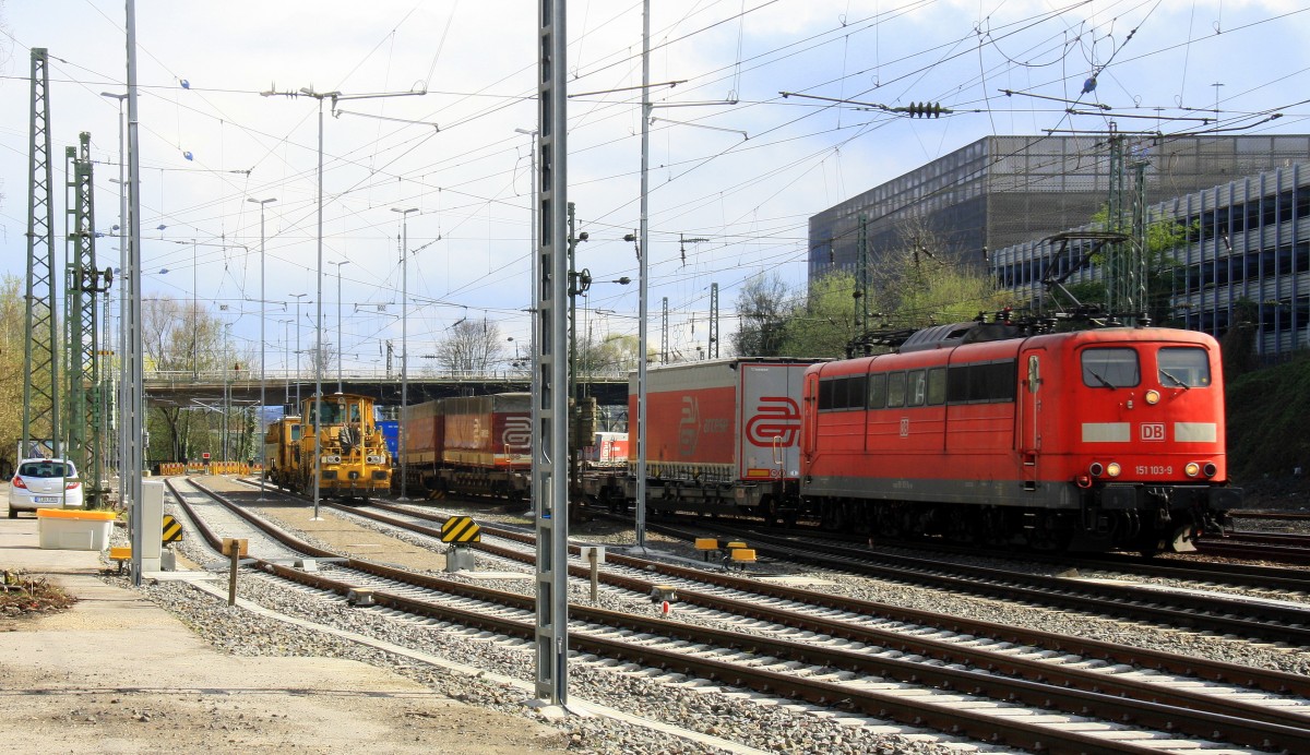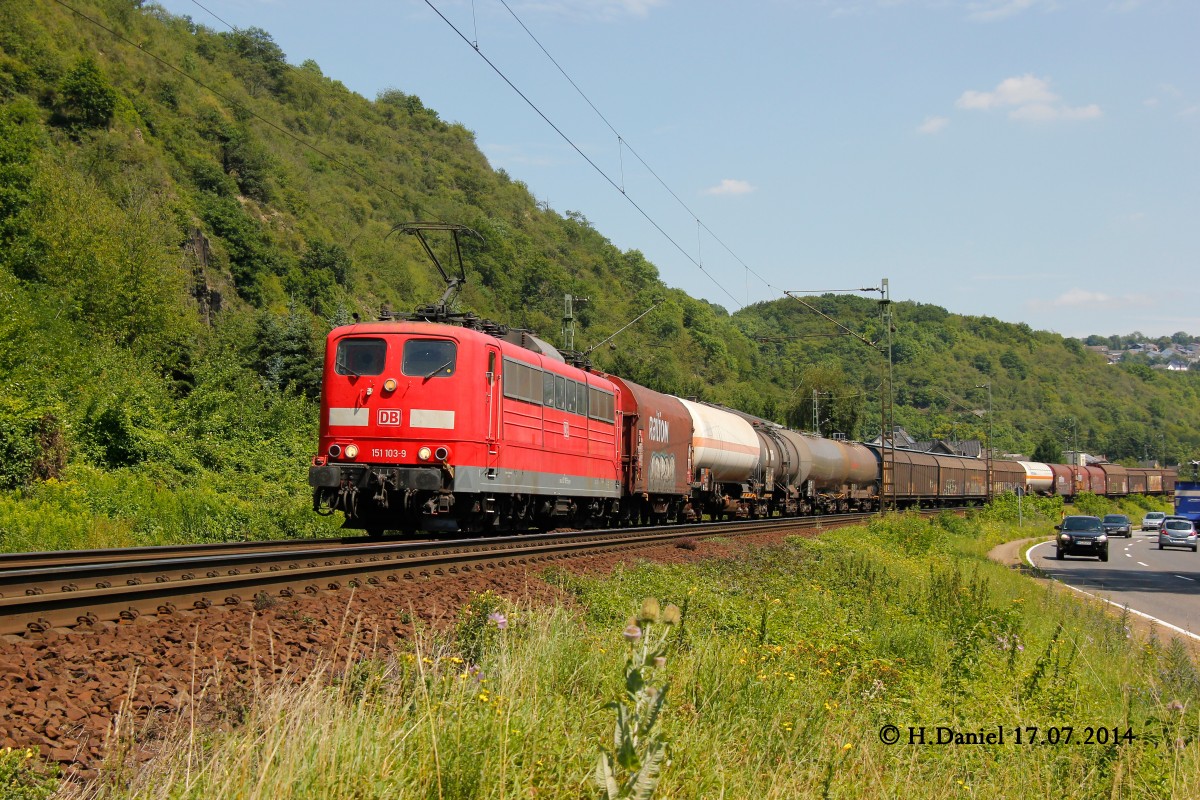 151 103-9 DB kommt durch Kohlscheid mit einem langen gemischten Güterzug aus Osnabrück nach Kortenberg-Goederen(B) und fährt die Kohlscheider-Rampe hoch nach Aachen-West bei schönem Frühlingswetter am 9.4.2014.