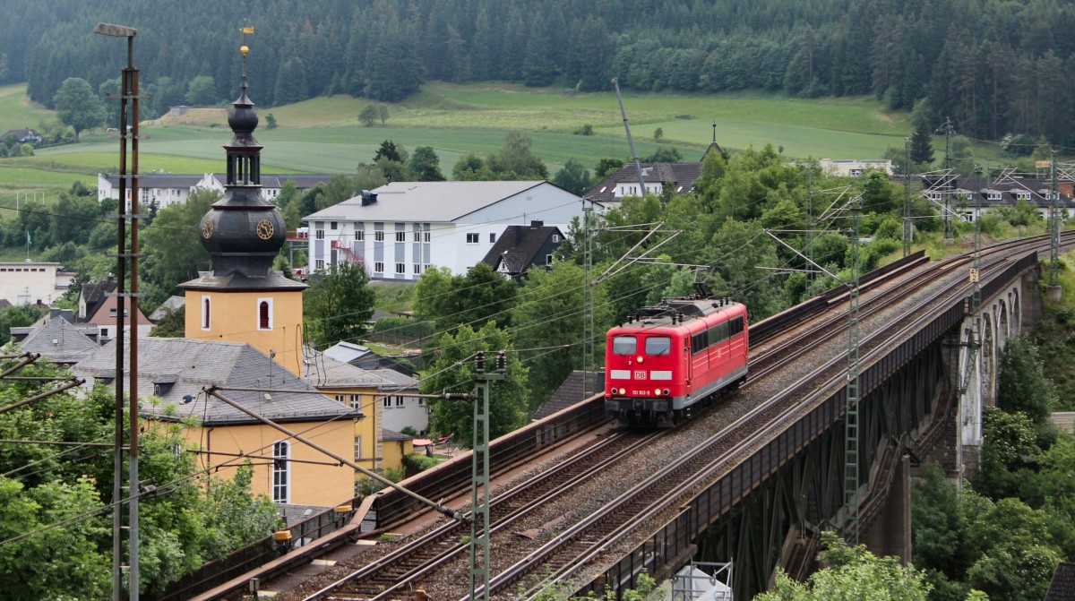 151 103-9 hat am 17.06.14 Schubdienst an der Frankenwald Nordrampe. Hier zu sehen bei der Rückfahrt nach Probstzella auf dem Trogenbachviadukt in Ludwigsstadt, um wenig später dem nächsten schweren Güterzug über den Berg zu helfen.