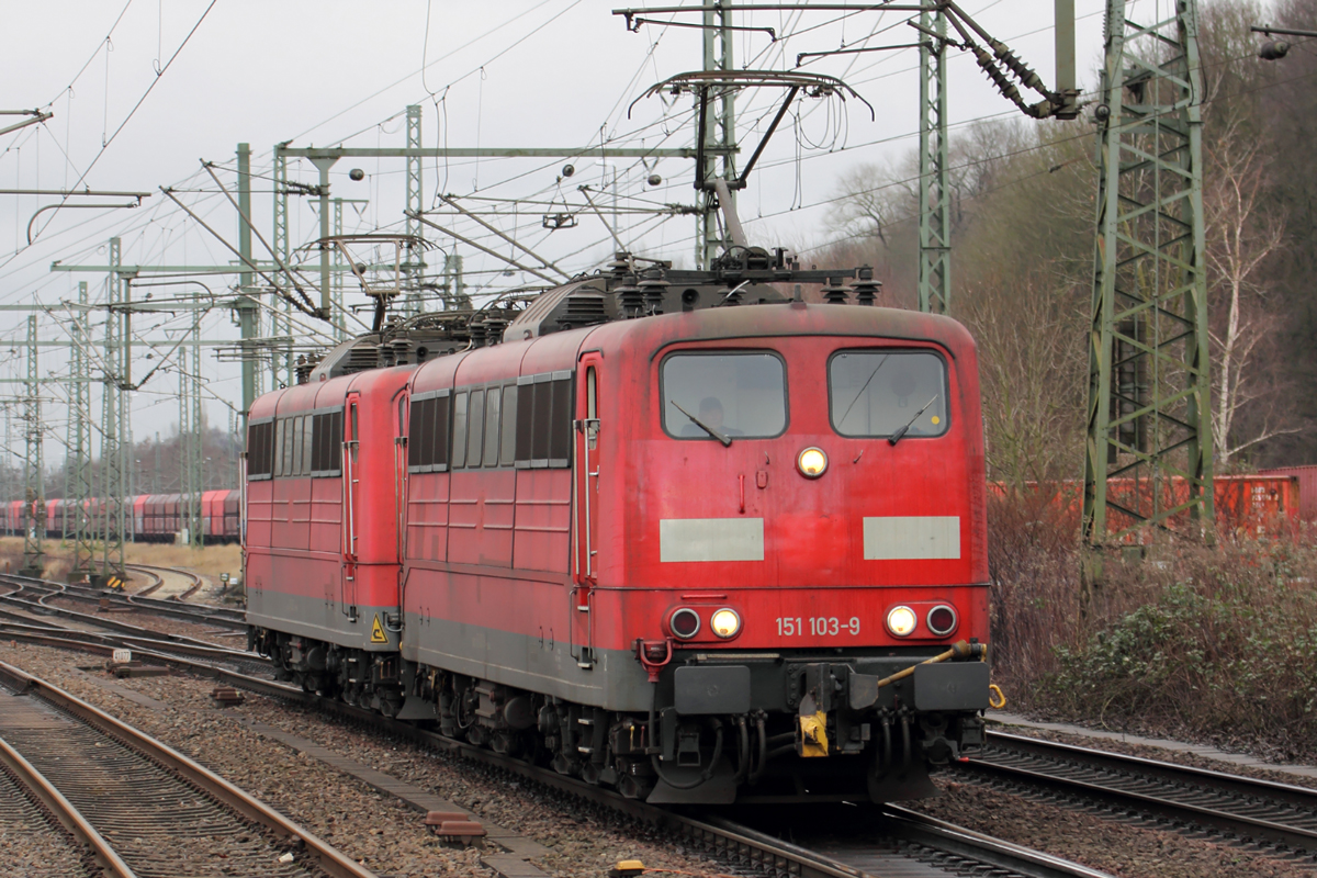 151 103-9 DB kommt die Kohlscheider-Rampe hoch aus Richtung Neuss,Herzogenrath mit einem Kurzen Kalkleerzug aus Hagen(D) nach Marche-les-Dames(B) und fährt durch Kohlscheid in Richtung Richterich,Laurensberg,Aachen-West.