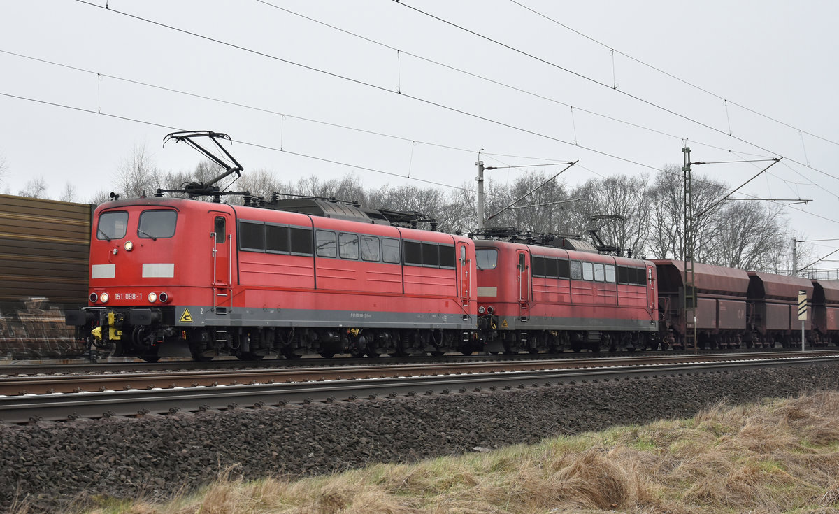 Der tägliche Erzzug mit zwei 151 (151 112-0, 151 103-9) von Railpool in Doppeltraktion, kommend aus Richtung Hamburg. Höhe Bardowick, 27.04.2018.