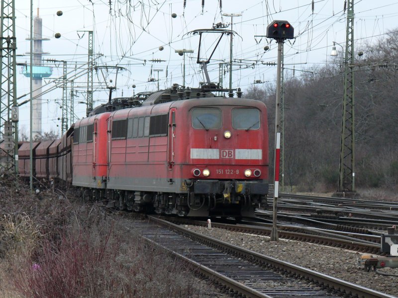 151 122-9 mit Schwesterlok durchfahren Köln-Gremberg mit einem Kohlezug am Haken. Ob der Lokführer noch viel durch die verschmutzten Frontscheiben sieht ? Aufgenommen am 09/02/2009. Dieter Schumacher