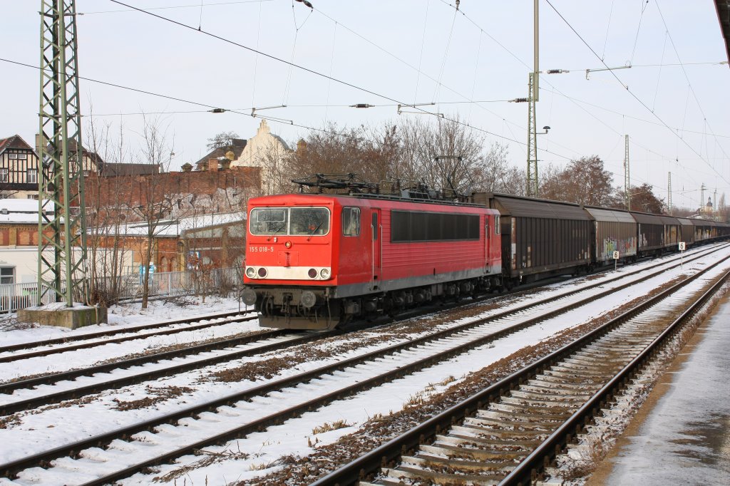 155 018-5 fährt mit einem Ganzzug Schiebewandwaggons durch Magdeburg-Buckau. Fotografiert am 01.02.2010.