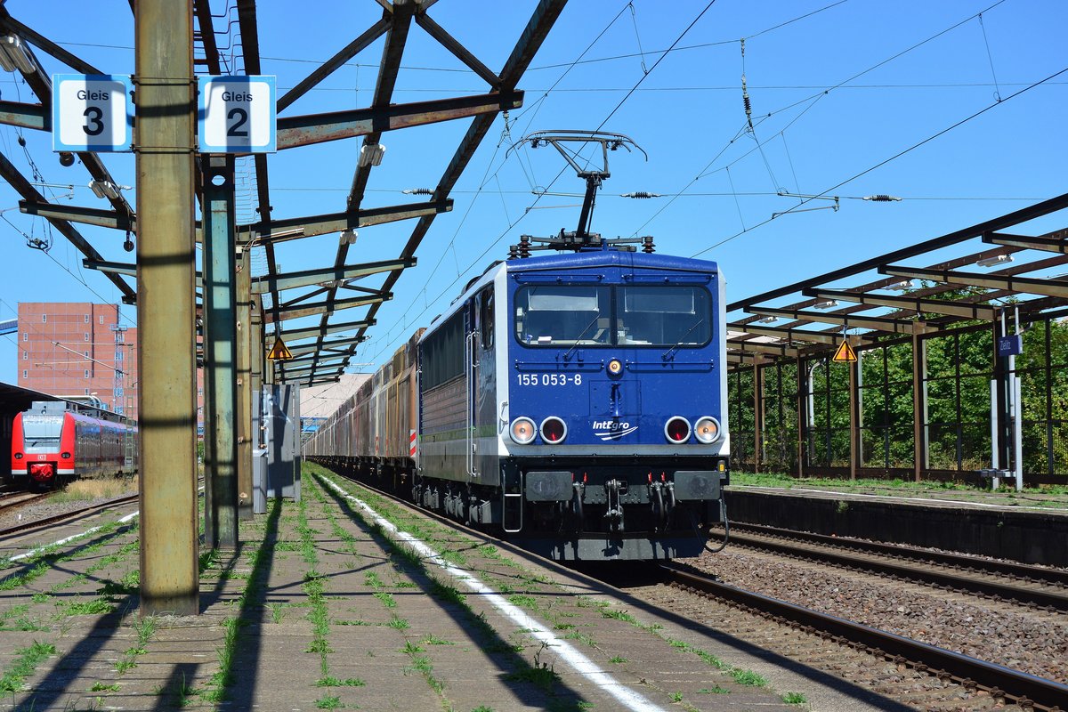 IntEgro Verkehr GmbH, Reichenbach (Vogtl.) mit der "155 053-8" (NVR: "91 80 6155 179-5 D-PRESS") und einem Ganzzug Schiebewandwagen am 29.06.22 Vorbeifahrt Bahnhof Magdeburg-Neustadt. Viele Grüße an den Tf. !!!!