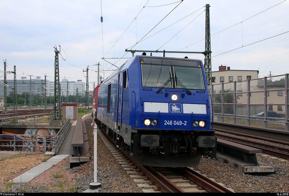 246 049-2 mit 155 053-8 (kalt) der Eisenbahn-Bau- und Betriebsgesellschaft Pressnitztalbahn mbH (PRESS) als Lokzug passiert den Interimsbahnsteig Halle(Saale)Hbf Gl. 13a auf der Ostumfahrung für den Güterverkehr in südlicher Richtung. [16.6.2018 | 7:00 Uhr]
