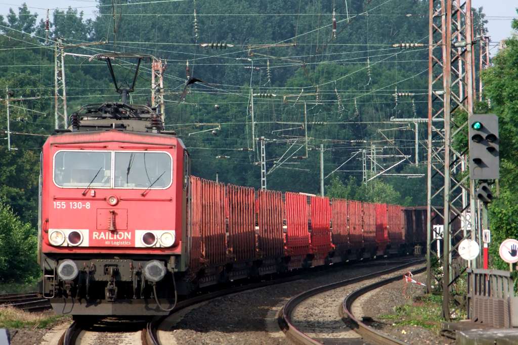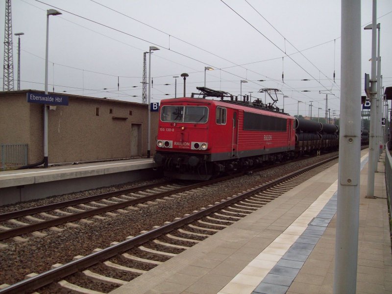 155 130-8 fuhr mit einem Rohrzug am 06.08.2009 durch Eberswalde