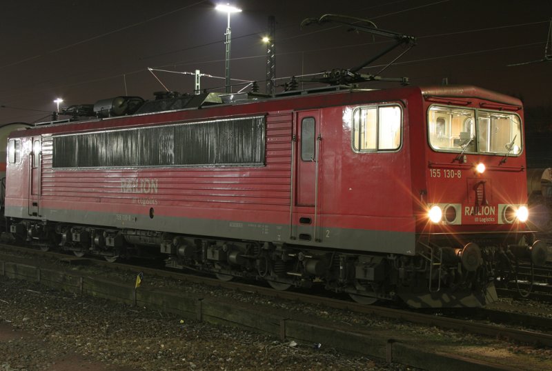 Die abfahrbereite 155 130-8 steht während der Bremsprobe der Güterwaggons wenige Minuten in Aachen West, aufgenommen am 30.12.2008