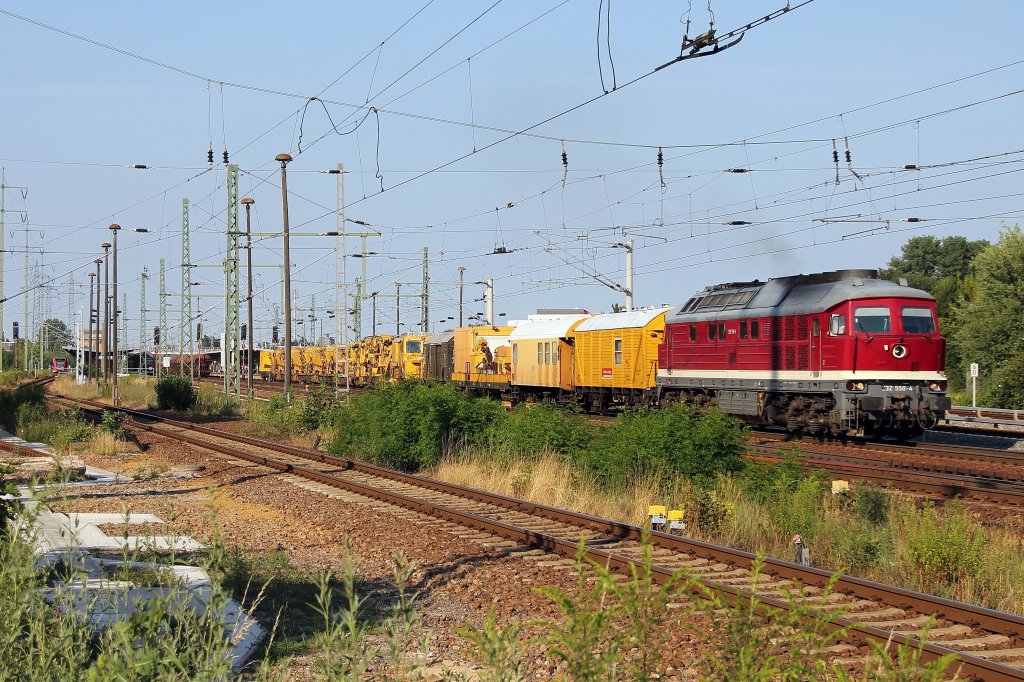 232 550-4 am 06. Juli 2011 mit einem Gleisbauzug* passiert den Bahnhof Berlin Schönefeld Flughafen stadtauswärts. Im Hintergrund stehen 155 175-3 mit einem Güterzug und der Triebwagen der Linie RB 22 diesmal auf einem anderen Gleis.