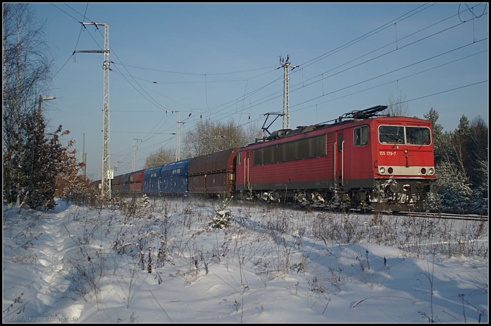Bei schönstem Winterwetter durcheilt 155 178-8 mit ihrem Erzzug am 18.12.2010 die Berliner Wuhlheide.