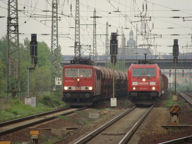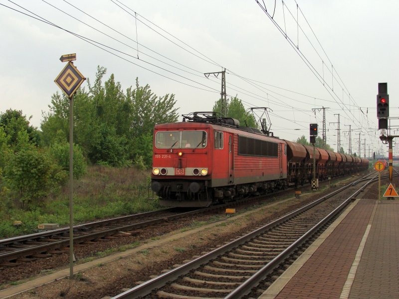 155 231-4 darf nach dem ICE TD ebenfalls den Bahnübergang am Bahnhof Magdeburg-Sudenburg passieren. Die Geduld der Autofahrer wurde dort auf eine harte Probe gestellt, etwa 5 Güterzüge in 20 Minuten, zusätzlich noch ein IC und eine Regionalbahn. Fotografiert am 30.04.2009