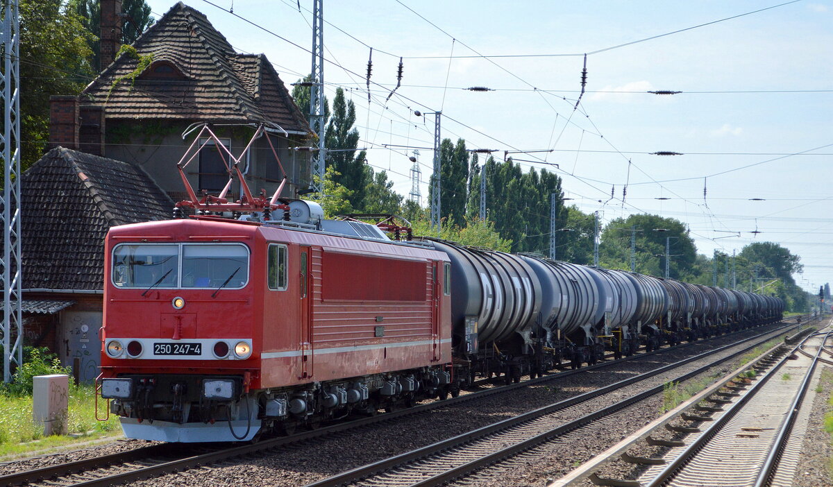 Leipziger Eisenbahnverkehrsgesellschaft mbH, Leipzig mit "155 247-0" [NVR-Nummer: 91 80 6155 247-0 D-LEG] mit Kesselwagenzug (leer) Richtung Stendell am 12.08.21 Berlin Buch. Lothar Stöckmann