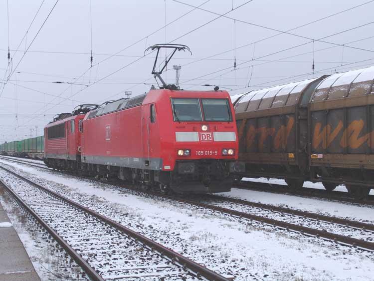Die 185 015-0 fährt gemeinsam mit 155 250-4 an den KLV-Zug nach Verona im Cargo-Bahnhof Rostock-Seehafen.Aufgenommen am 13.03.05