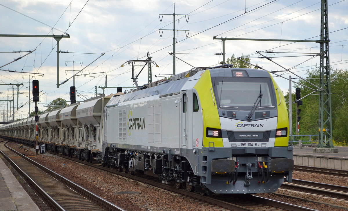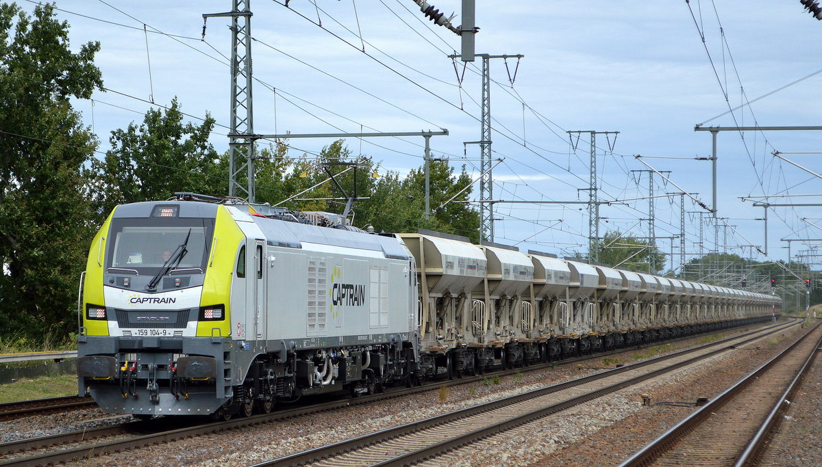 ITL mit ihrer Eurodual "159 104-9" (NVR: "90 80 2159 104-9 D-ITL") und einem Ganzzug Schüttgutwagen am 08.09.20 Durchfahrt Bf. Golm (Potsdam). Lothar Stöckmann