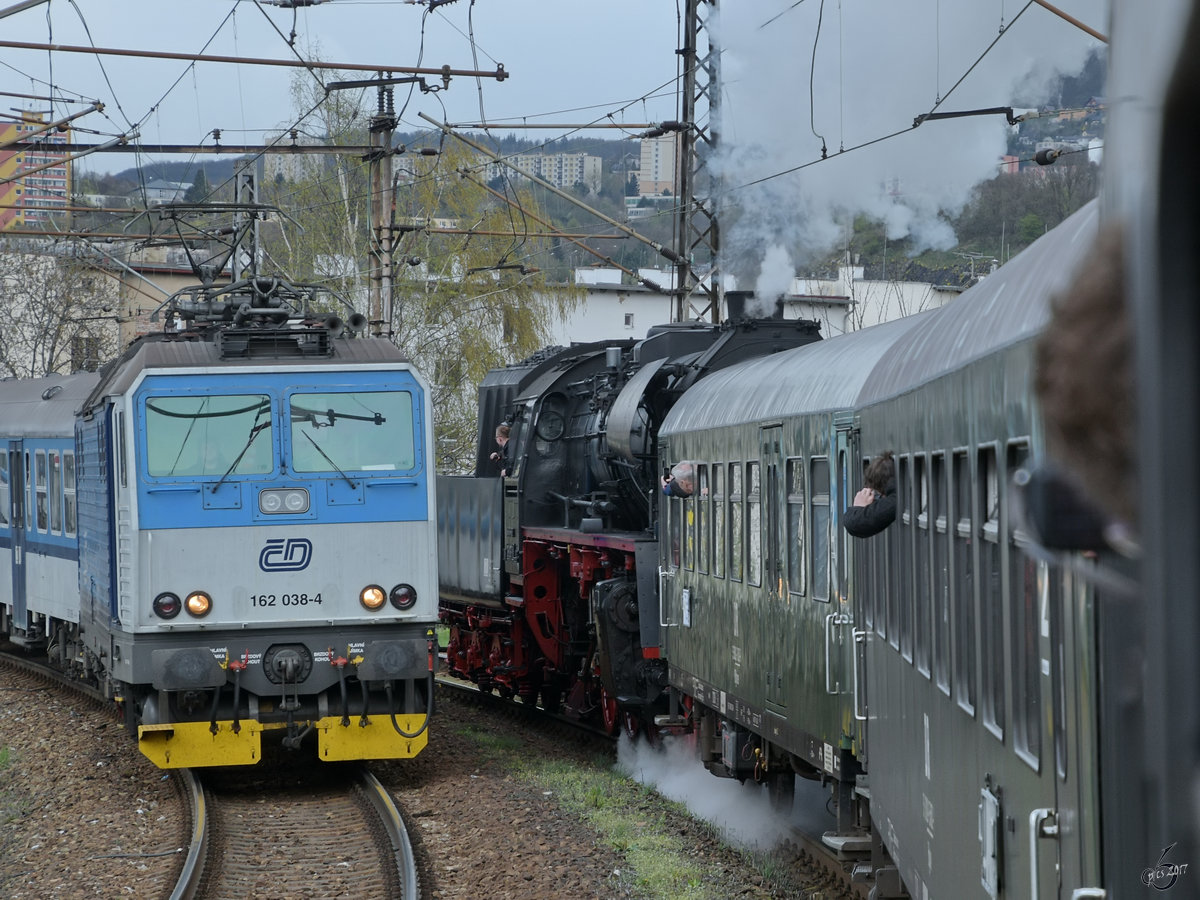 Treffen der Generationen. Die 35 1097-1 zieht uns in Richtung Děčín, während die 162 038-4 einen Personenzug nach Prag bringt.