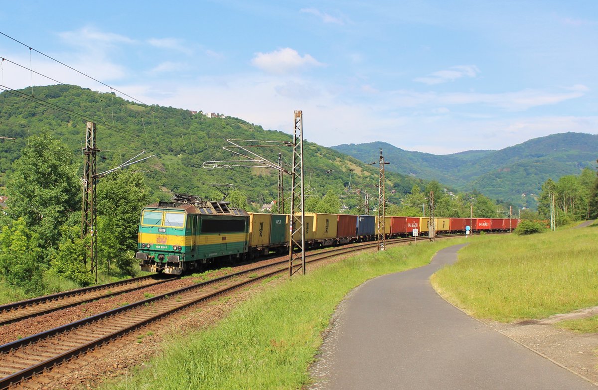 163 215-7 zu sehen am 23.05.18 mit einem Containerzug bei Sebuzín.