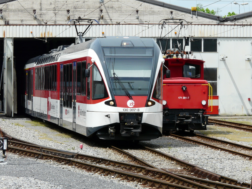 zb - Triebwagen ABe 130 007-8 und  Te 2/2 171 201-7 vor dem Depot / Werkstätte in Stansstad am 08.05.2012