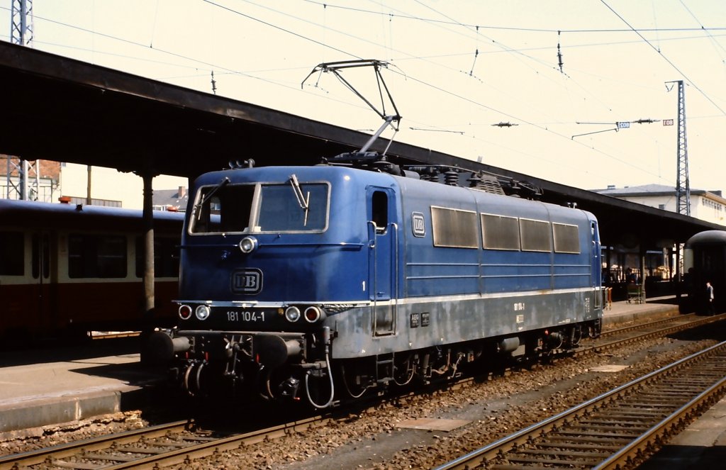 181 104-1 übernimmt in Trier Hbf. den Schnellzug nach Luxemburg. (Mitte bis Ende der 1970er Jahre).