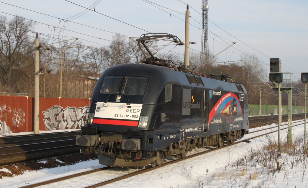 ES 64 U2 - 002 (182 502-5) MRCE Dispolok GmbH für ODEG - Ostdeutsche Eisenbahn GmbH mit dem RE4 (RE 37316) von Ludwigsfelde nach Rathenow bei Nennhausen. 26.12.2012 Stephan Kemnitz
